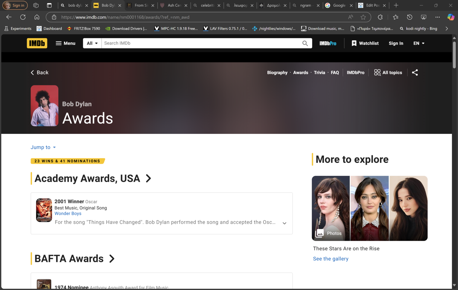 I also included in this comparison the famous Bob Dylan, who is considered one of the greatest songwriters. This is because he acted in documentaries (e.g., Renaldo and Clara (1978)), and has won one Oscar for his music. In addition, in 2016 Dylan was awarded the Nobel Prize in Literature.