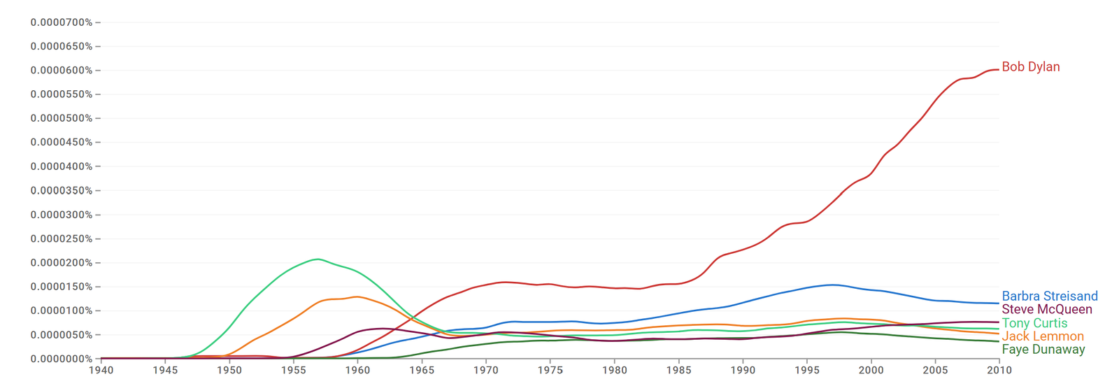 The use of Ngram shows that Bob Dylan has a fame of 60 famons. He climbs to the top of fame scale so far, surpassing Elvis.