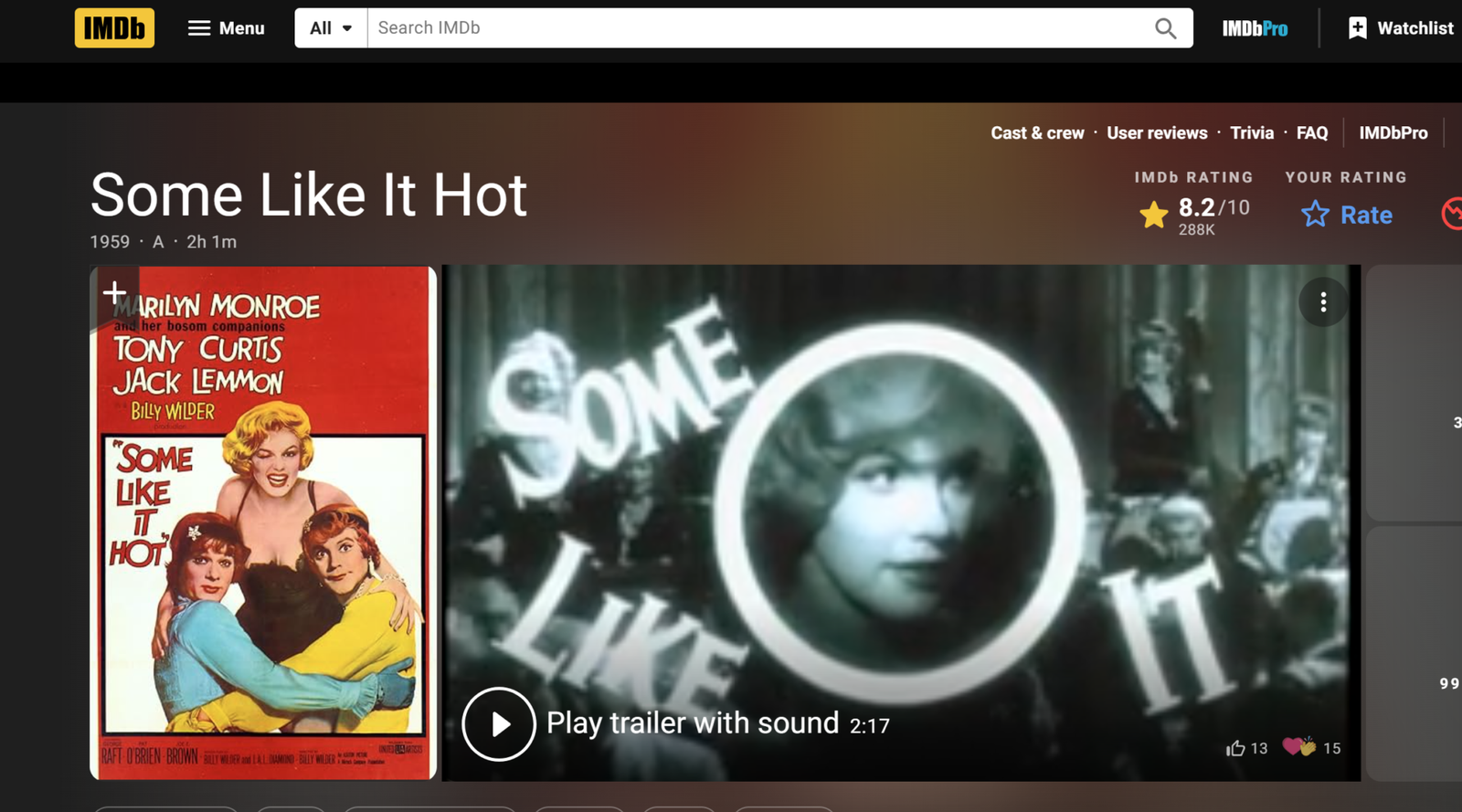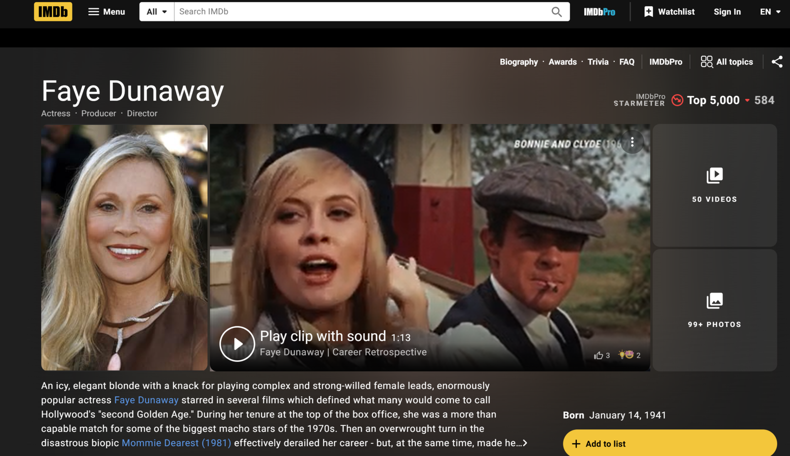 The protagonists of the classic comedy Some Like it Hot, Jack Lemmon and Tony Curtis, enjoy fames of 5.4 and 6.2 famons, respectively. Finally, Faye Dunaway, the beautiful protagonist of the crime movie Bonnie and Clyde, has a fame of 3.5 famons.