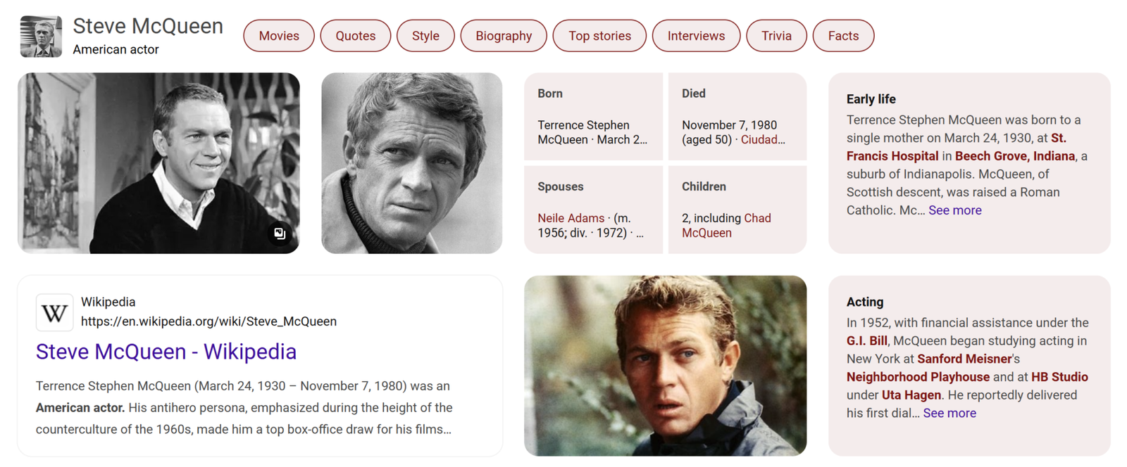 Bob Dylan is followed by the actress of the sweet romantic movie The Way we Were, Barbra Streisand (11.5 famons), and Steve McQueen (7.5 famons), the cool protagonist of the atmospheric thriller The Tomas Crown Affair.