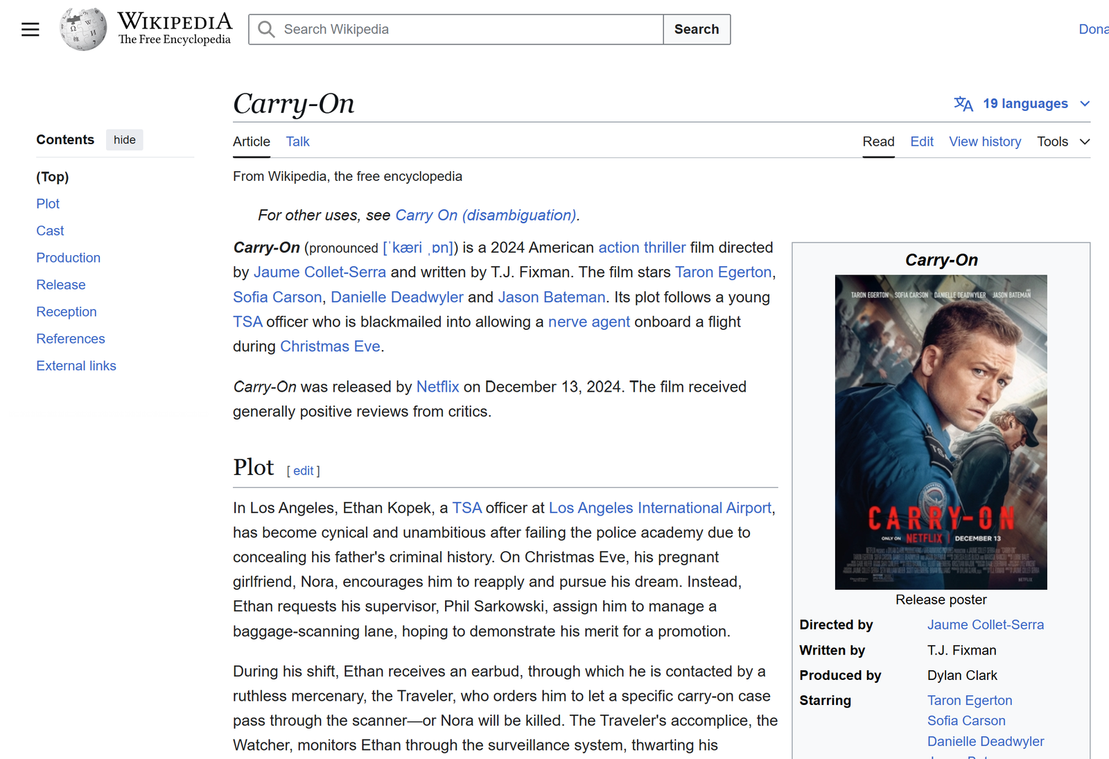 Carry-on is an action movie directed by Jaume Collet-Serra. The protagonists include Taron Egerton, Jason Bateman and Sofia Carson. Jaume is known from directing Liam Neeson in many action movies.