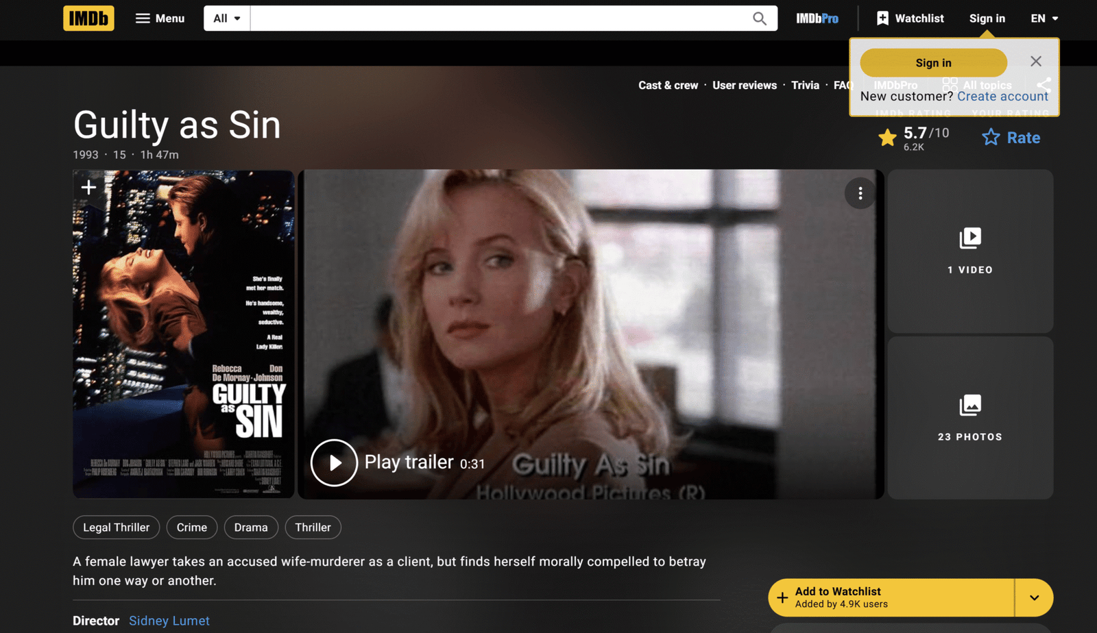 Guilty as Sin is an atmospheric thriller you can watch it again and again. A real diamond of the 1990s.