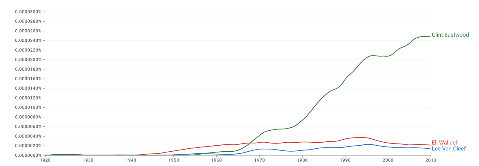 The names of Wallach and Van Cleef appear in the English electronic books after the 1940s and 1950s, respectively. The name of Eastwood appears in the books in the mid 1950s. Moreover, the frequency of appearance of their names increases sharply after these dates.