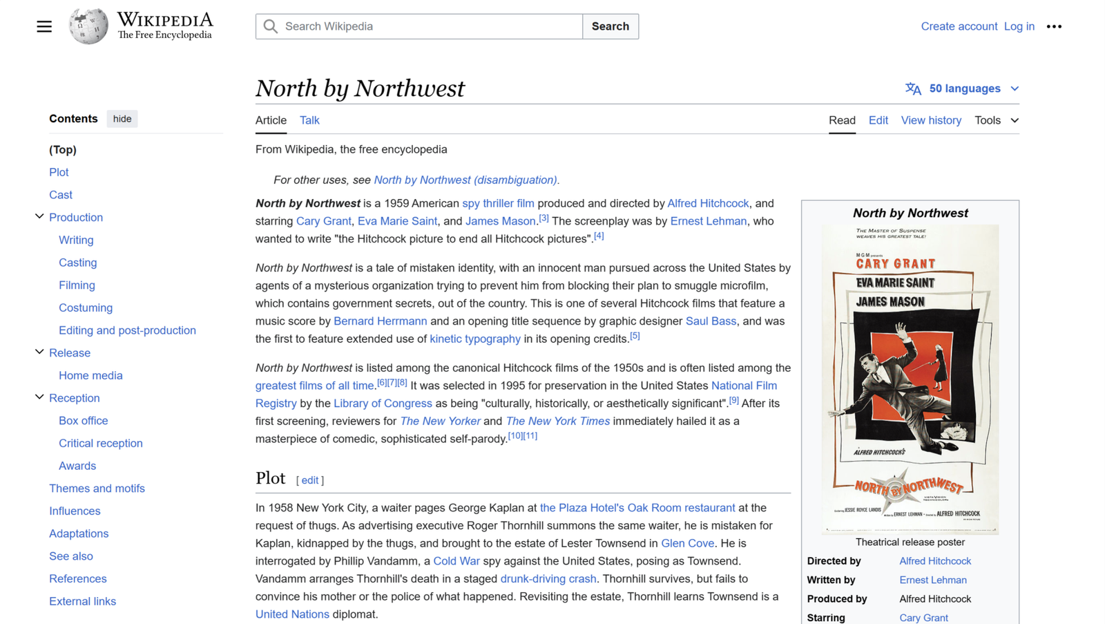 North by Northwest is a 1959 thriller movie directed by Alfred Hitchcock. The cast includes Cary Grant, Eva Marie Saint and James Mason.