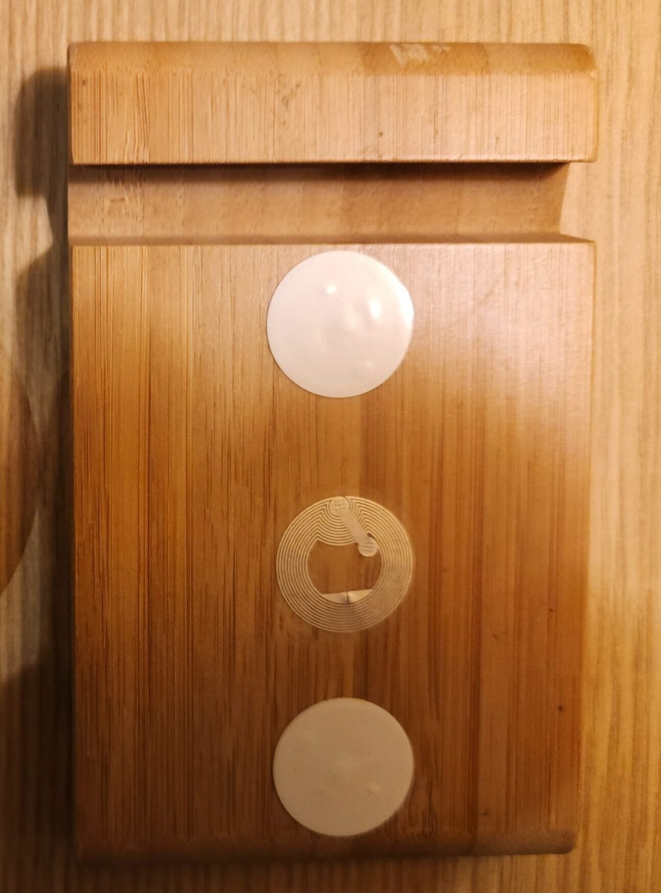 NFC tags are very handy accessories. They are tiny, unobtrusive, need no battery and are very cheap, about 10-20 cents each. You can stick them (Figure 2) on or under any surface or object that is less than 4 cm thick, behind the old switches, etc, inside and outside the house.