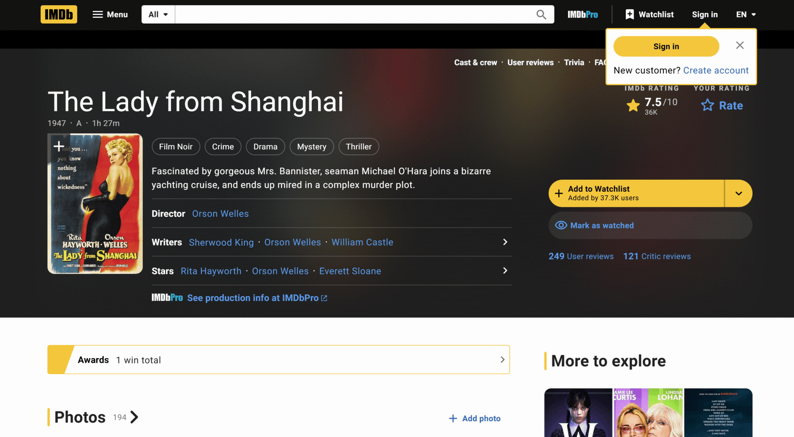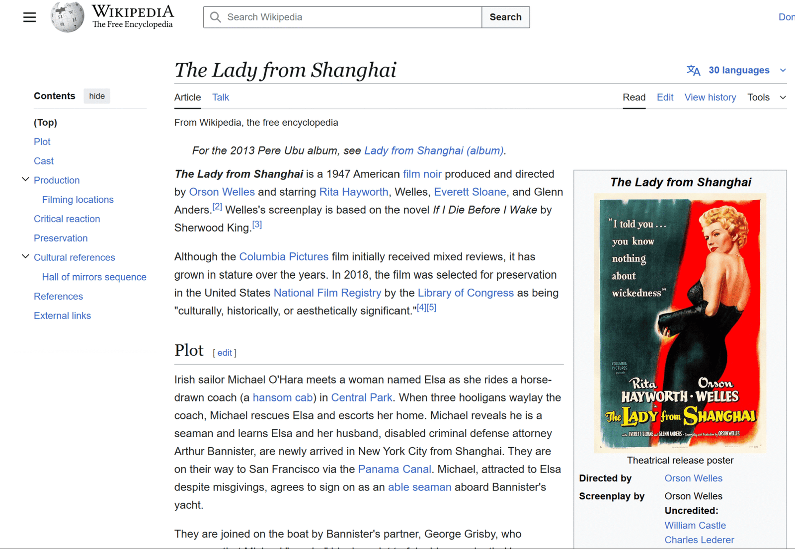 The Lady from Shanghai (1947) is an American film noir. Orson Welles produced and directed it. The main stars are Rita Hayworth, Orson Welles, Everett Sloane and Glen Anders.