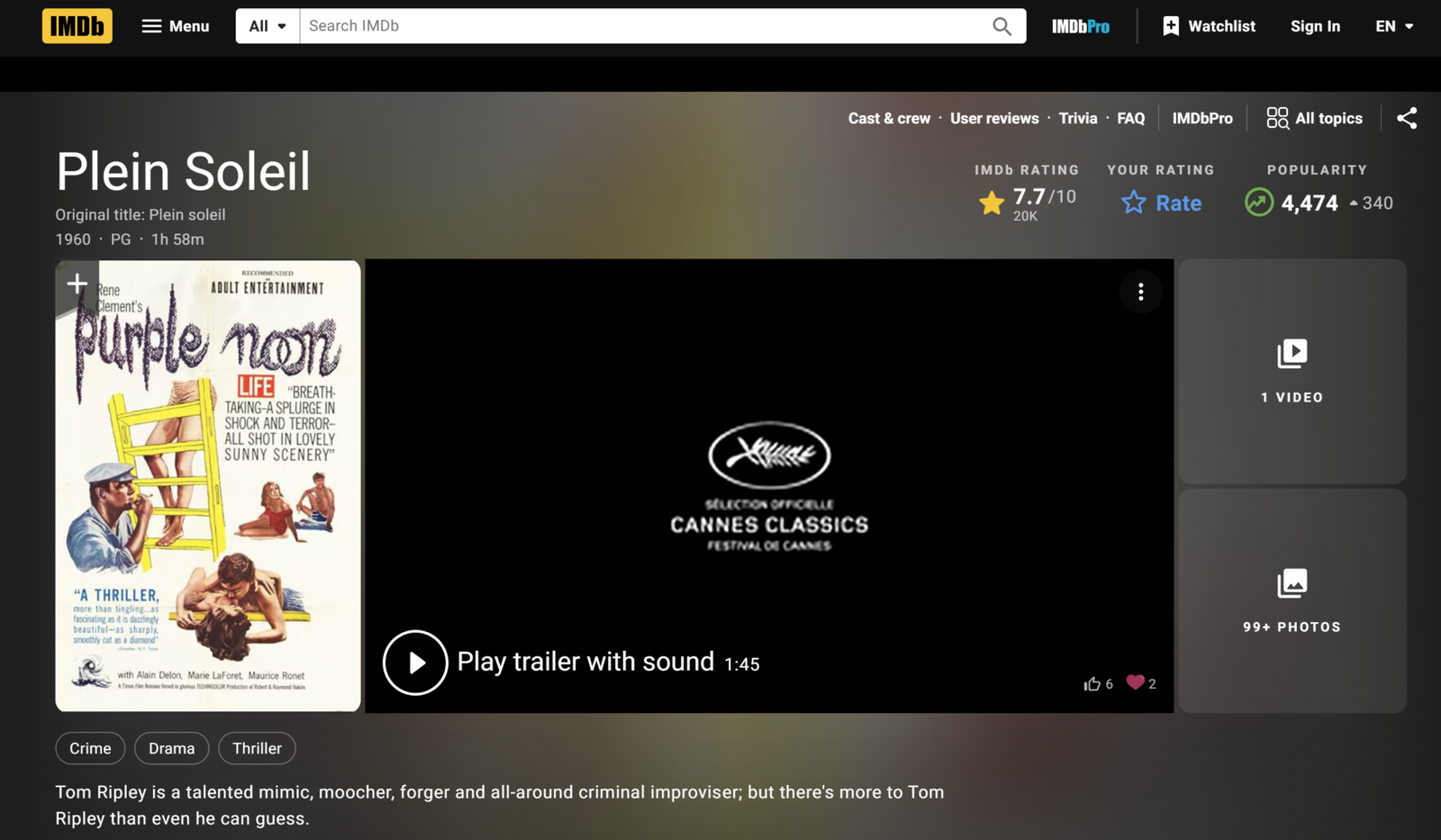 Purple Noon certainly deserves a leading place in any cinephile library.