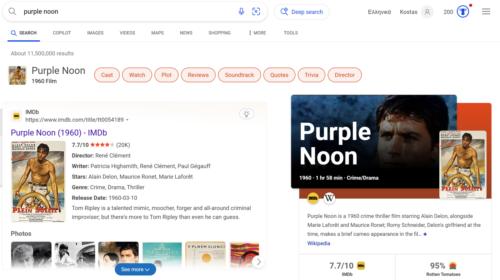 Purple Noon is a 1960 French crime thriller movie directed by Rene Clement. The original French title is Plein Soleil. The cast includes Alain Delon, Maurice Ronet and Marie Laforet.