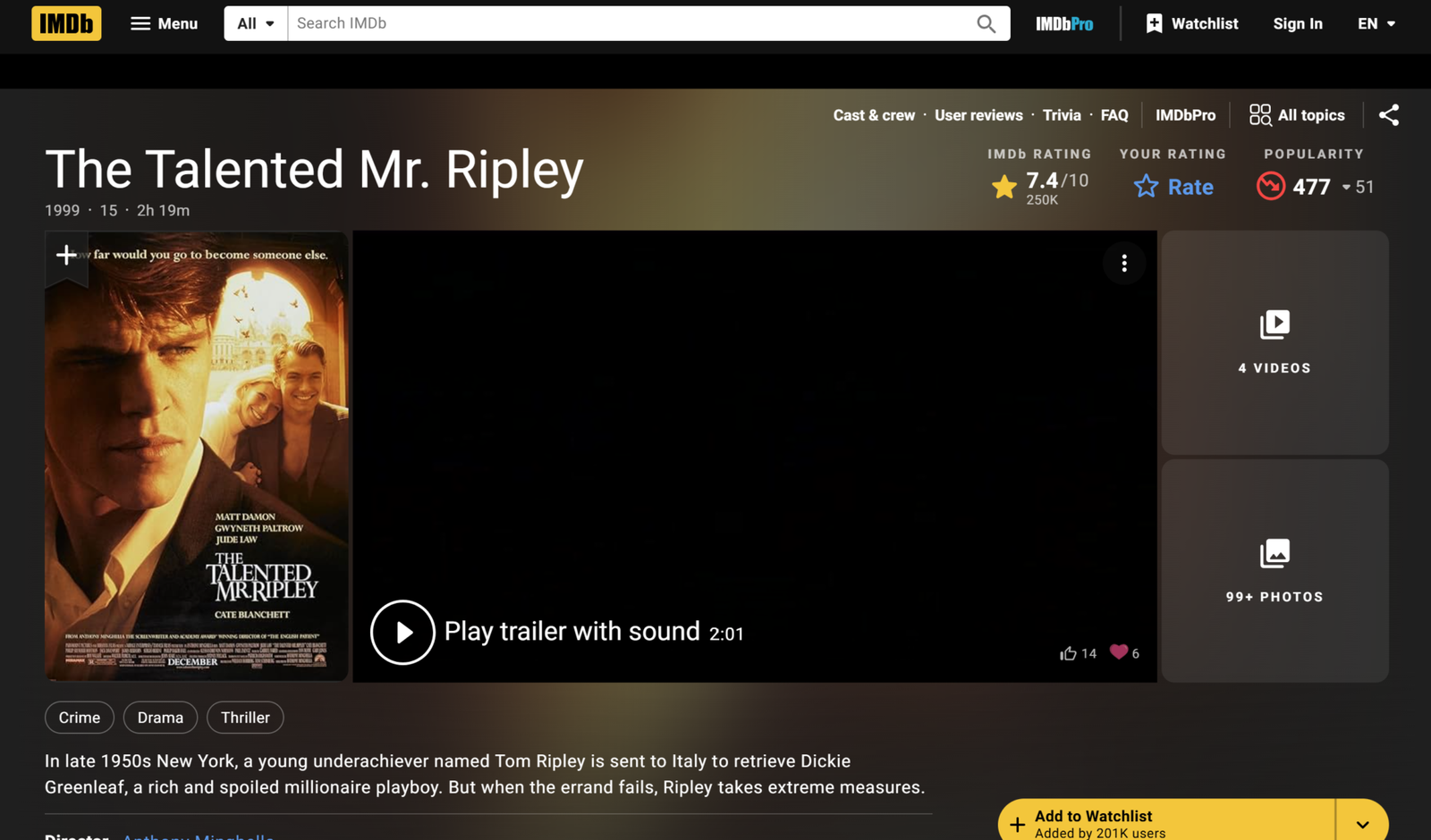 The 1999 film The Talented Mr. Ripley was also a very successful adaptation of the same novel. It was directed by Anthony Minghella and the protagonists were Matt Damon, Jude Law and Gwyneth Paltrow. It has an IMDB score which is by 0.3 lower than the original one.