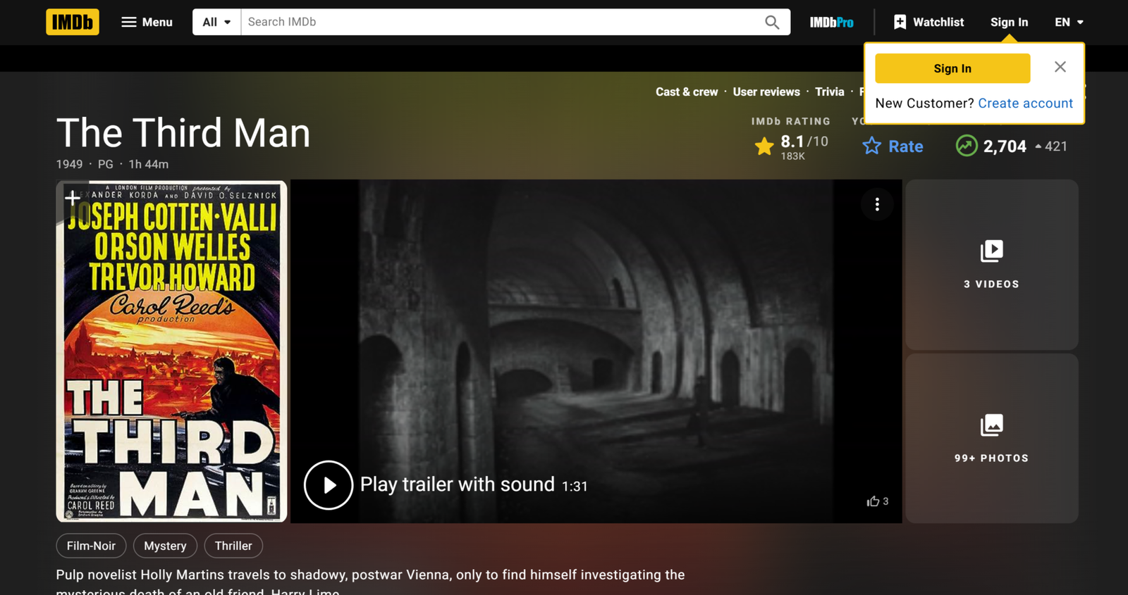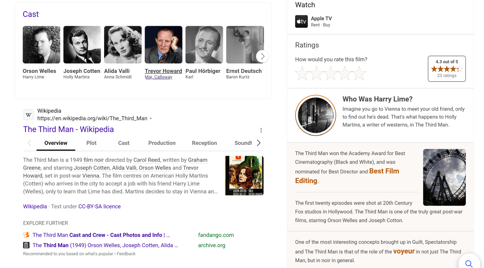 The Third Man is a 1949 British film noir, written by Graham Greene and directed by Carol Reed. The cast includes Joseph Cotten, Alida Valli, Orson Welles, Bernard Lee and Trevor Howard.
