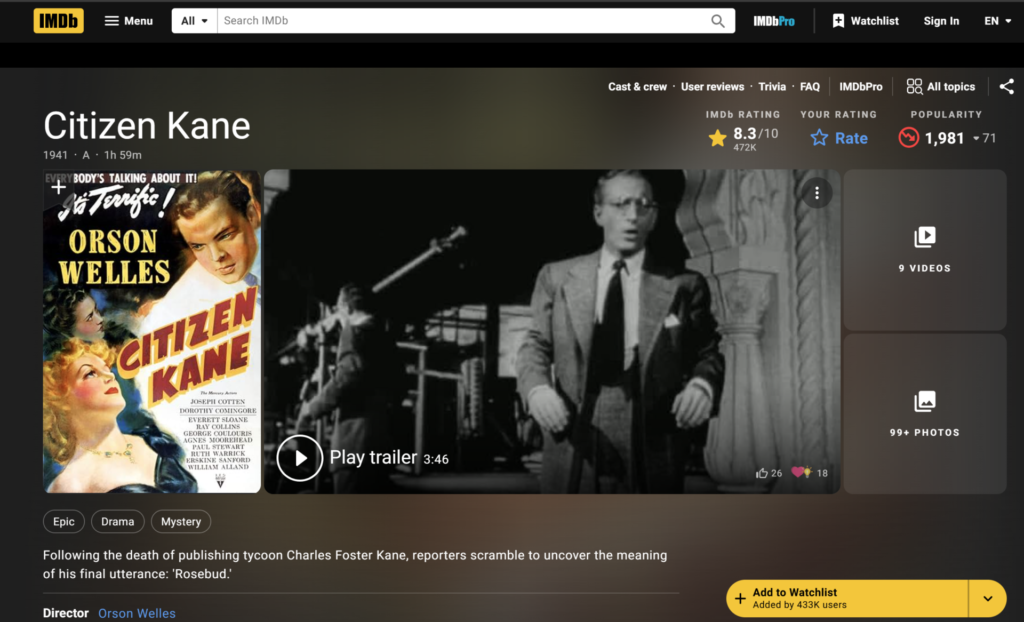 A newsreel obituary tells the life story of Kane, an enormously wealthy newspaper publisher and industry magnate. Kane’s death becomes sensational news around the world. The newsreel producer assigns reporter Jerry Thompson (played by Alland) the task to discover the meaning of the word “Rosebud”. Thompson sets out to interview Kane’s friends and associates.