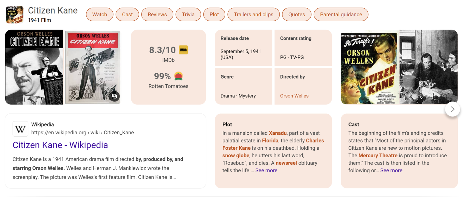 Citizen Kane is a 1941 American drama film directed by Orson Welles. The cast includes Orson Welles, Joseph Cotten, William Alland, Dorothy Comingore and Agnes Moorehead.