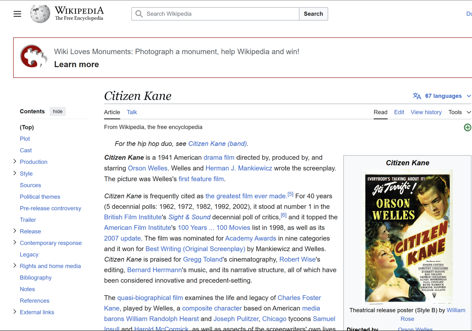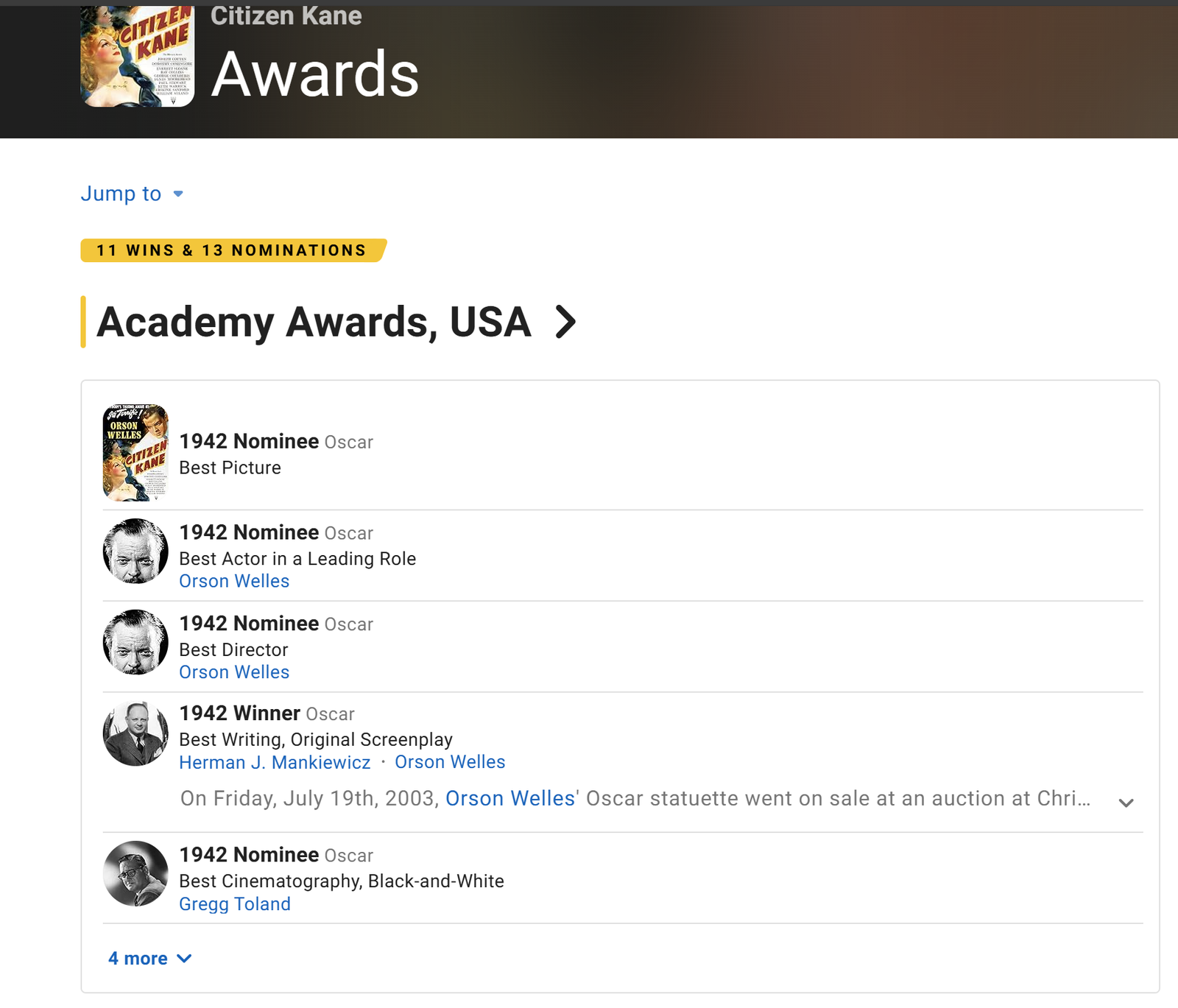 Citizen Kane was Welle’s first feature film. It is considered as the greatest film ever made. It was nominated for Academy Awards in nine categories. It won the Oscar for Best Writing (Original Screenplay; Herman J. Mankiewicz and Welles).
