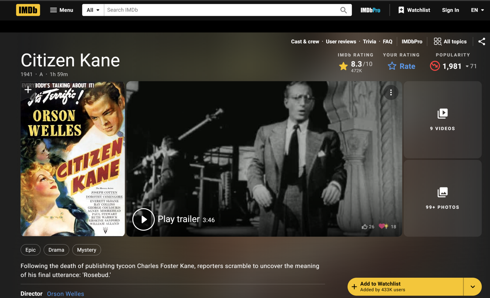 Citizen Kane is a masterpiece. It deserves by all means a leading place in any cinephile library.