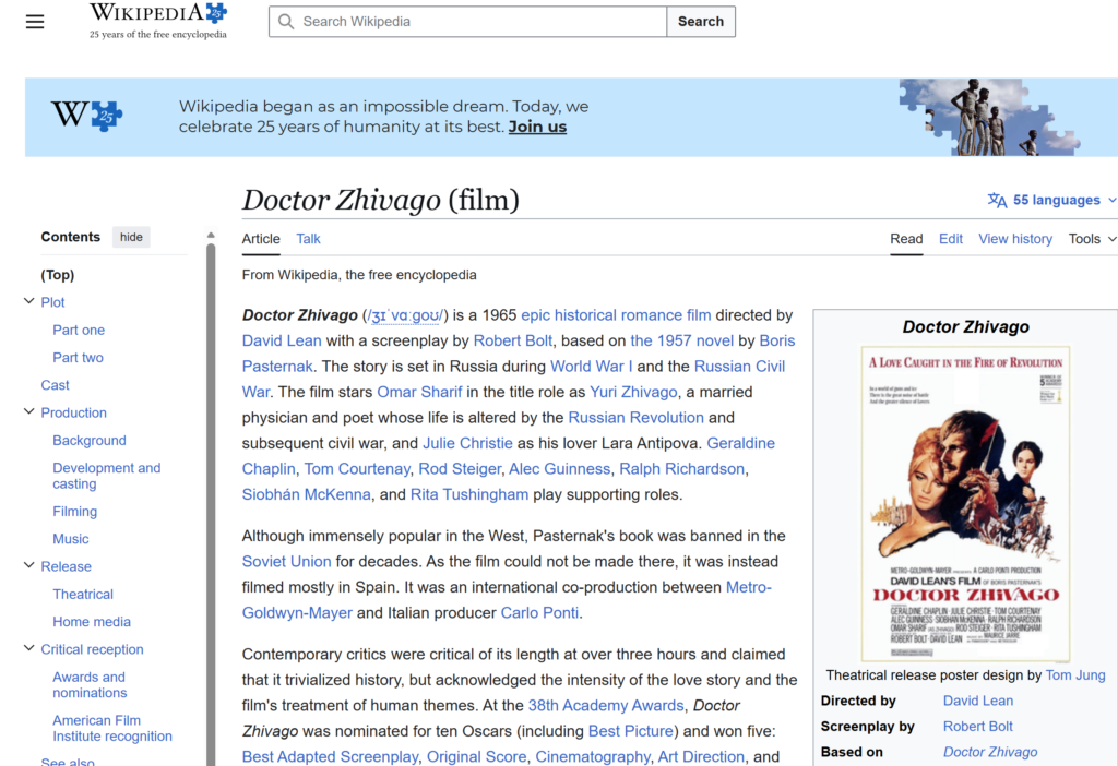 Dr. Zhivago is a 1965 epic historical romance film. David Lean directed it. Robert Bolt wrote the screenplay, which was based on Boris Pasternak’s 1957 novel.