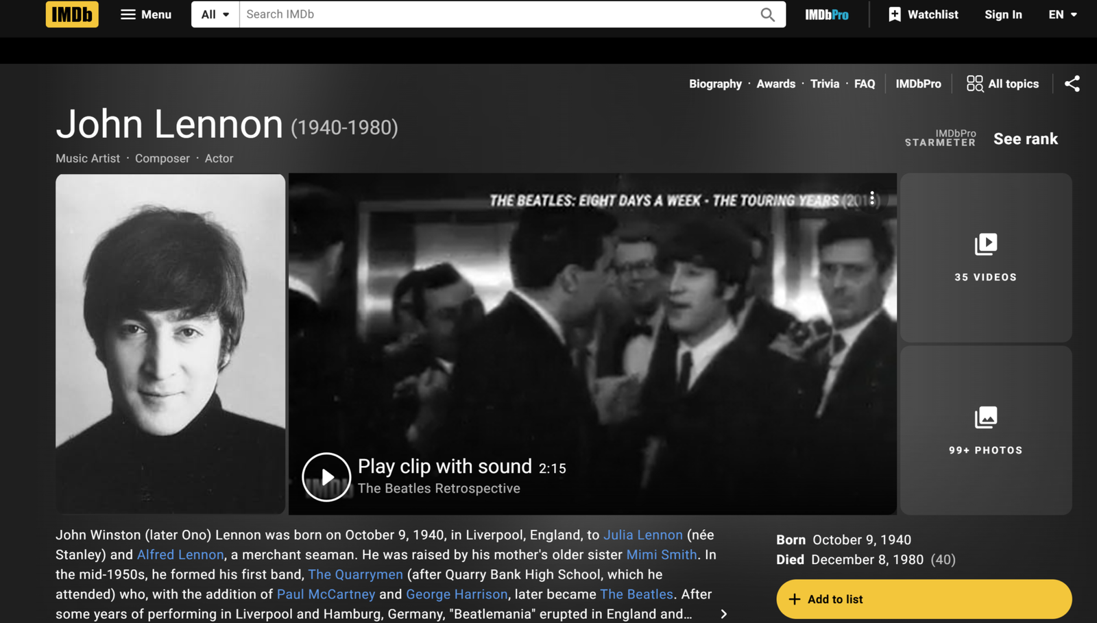 In this comparison, I also include the legendary member of the Beatles, John Lennon. This is because IMDB lists him as Music Artist, Composer and Actor.