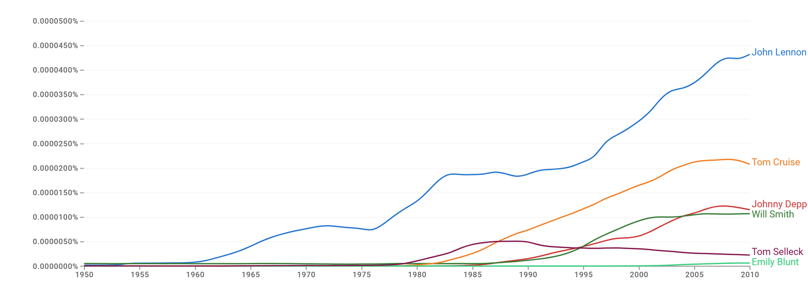 The use of Ngram, shows that Lennon is at the top, with 43 famons. Thus, Lennon so far ranks fifth closely following Wayne, Monroe and Sinatra.