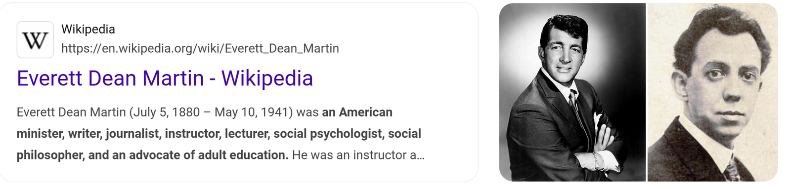 Martin’s name appears in the electronic books much earlier than his first movie, in 1949, or his first single in 1948. These appearances in the books refer to Everett Dean Martin (1980-1941) who was an American Minister, writer, journalist, instructor and lecturer. Thus, part of Dean Martin’s fame is attributed to the Minister Martin.