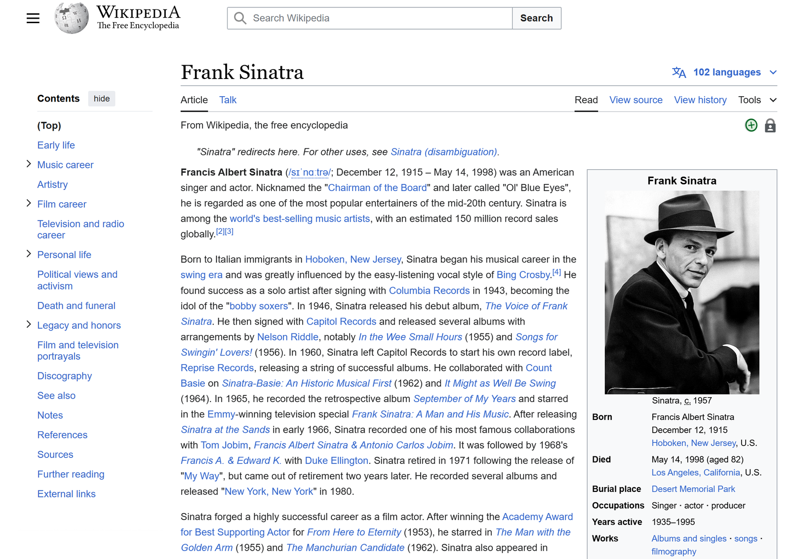 The analysis showed that Sinatra ranks third, among all actors/actresses checked so far, with 48 famons, closely following Monroe and Wayne.