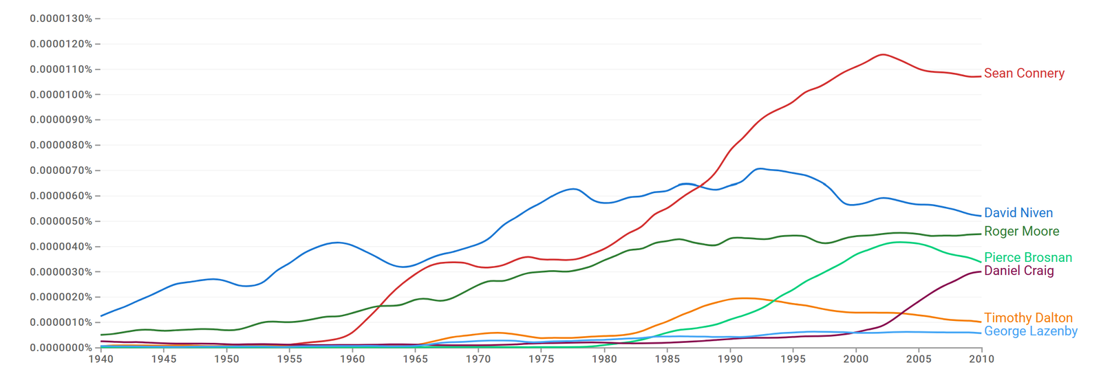 The Ngram analysis shows that the most famous James Bond actor is Sean Connery with fame of 11 famons. Connery has one Oscar for best supporting actor. David Niven, with 5 famons, ranks second. He has also one Oscar for best leading actor.