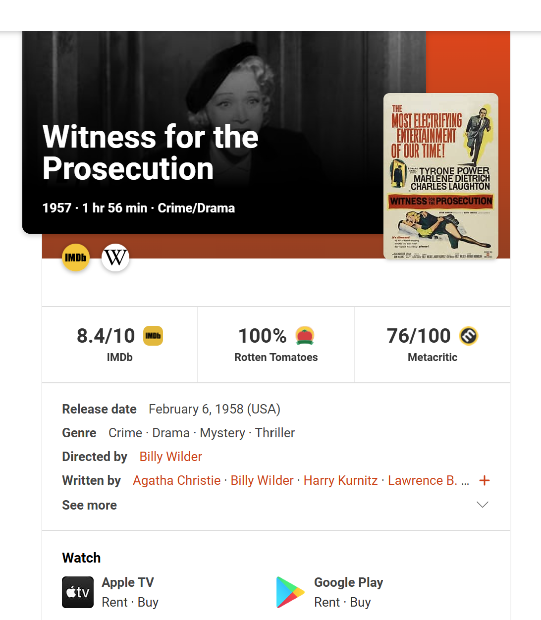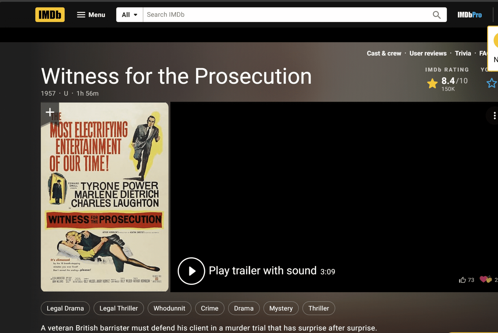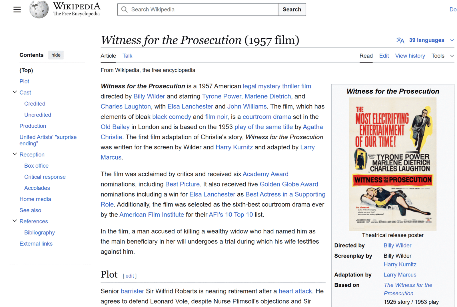 The plot of the movie is based on an Agatha Christie story. A barrister (Laughton) decides to defend an innocent looking man (Power). The man is accused of killing an old lady. The wife of the man (Dietrich) is one of the decisive witnesses. The performances are superb. The plot twists come one after the other.
